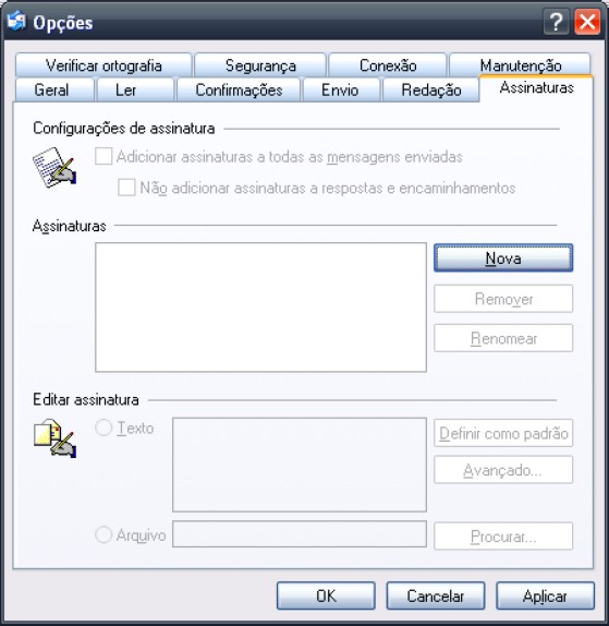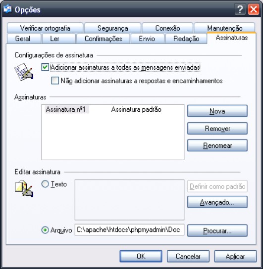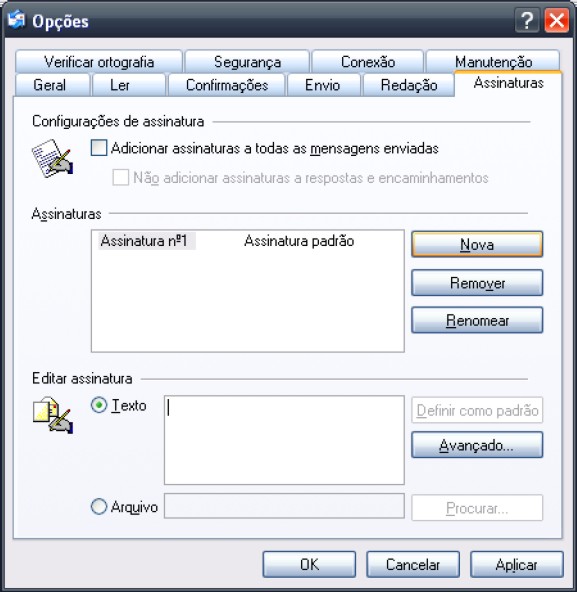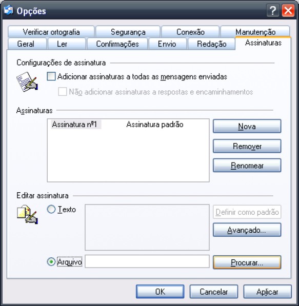 7-) Feito isso, irá aparecer a janela abaixo. Marque a opção ADICIONAR ASSINATURAS A TODAS AS MENSAGENS ENVIADAS.